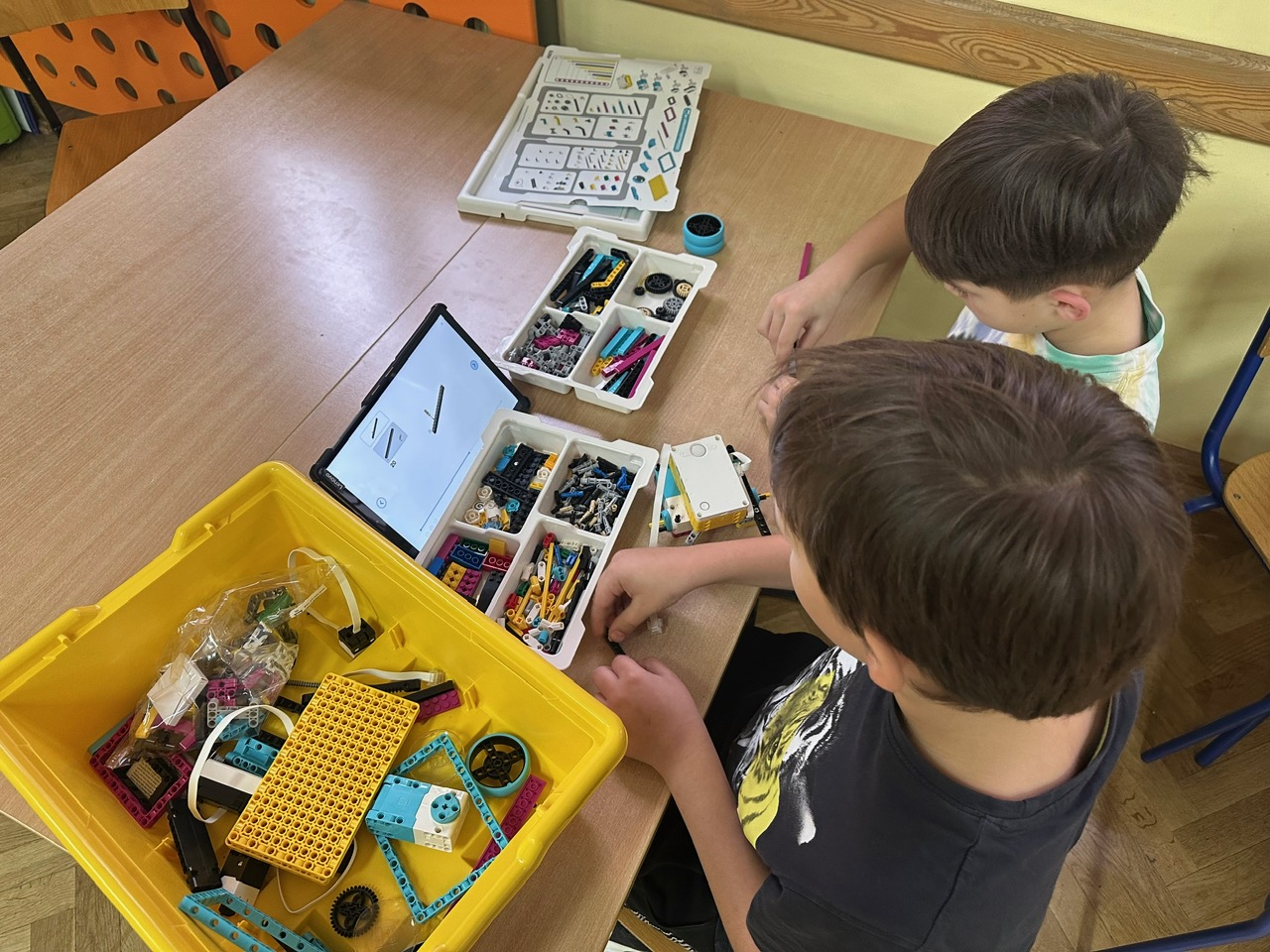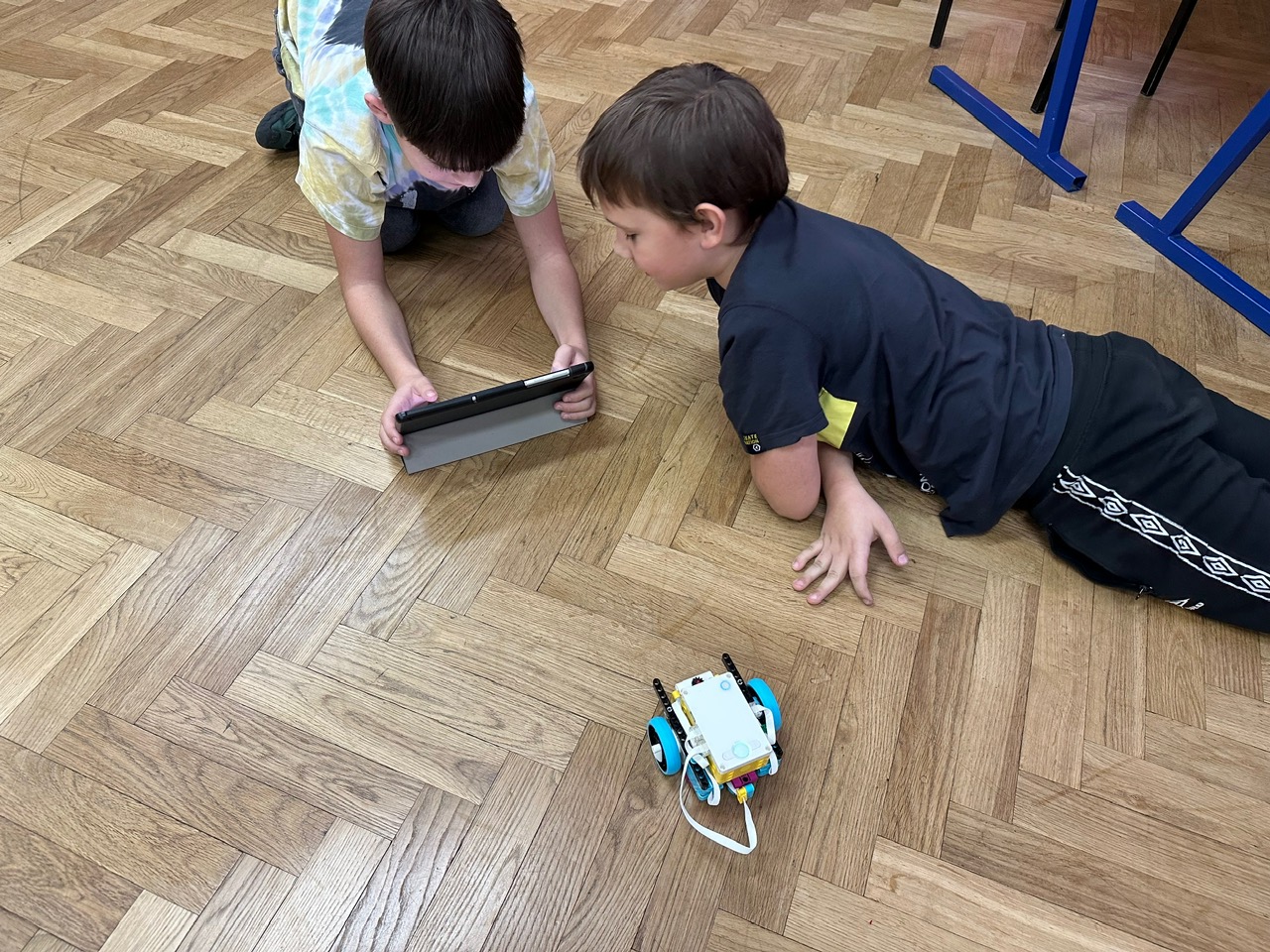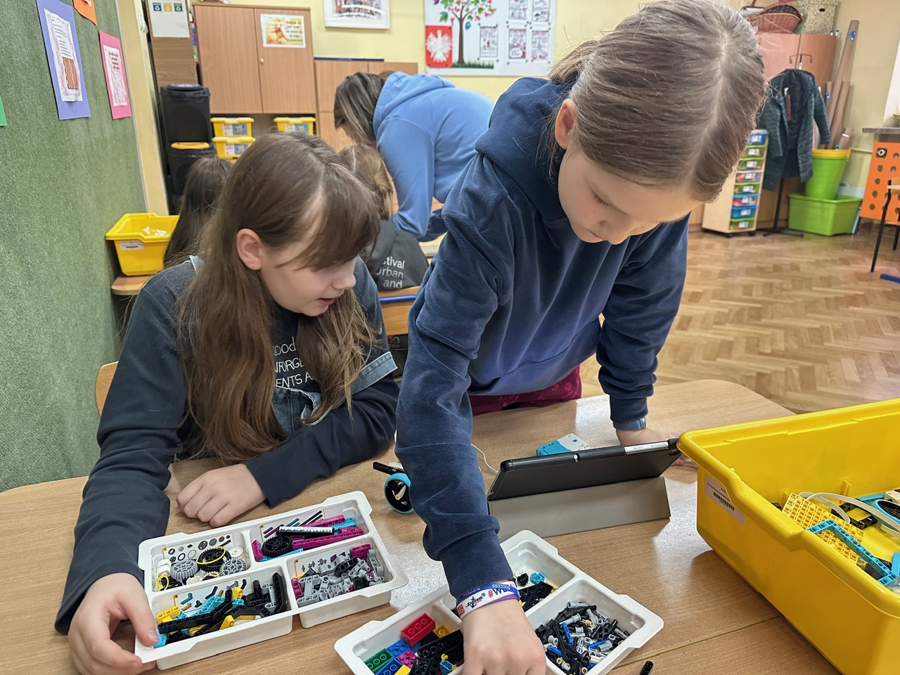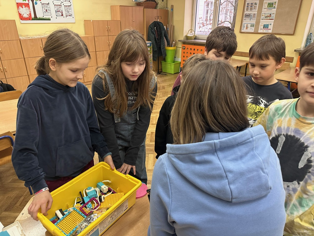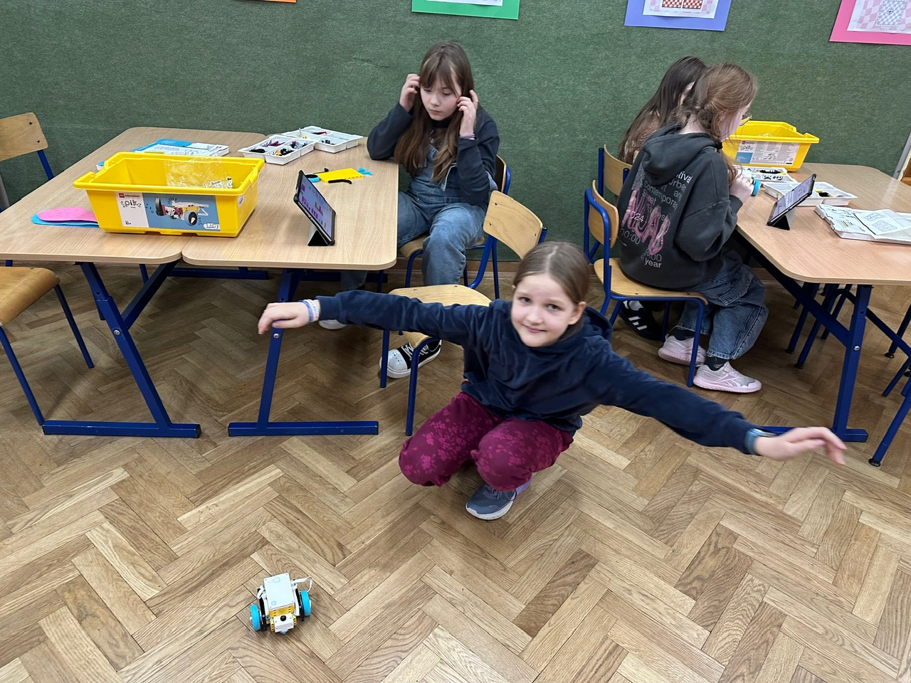 Kolejne zajęcia robotyczne w klasach czwartych również poświęcone były zestawom konstrukcyjnym Lego Education Spike. Tym razem dzieci skonstruowały jeżdżące roboty.
