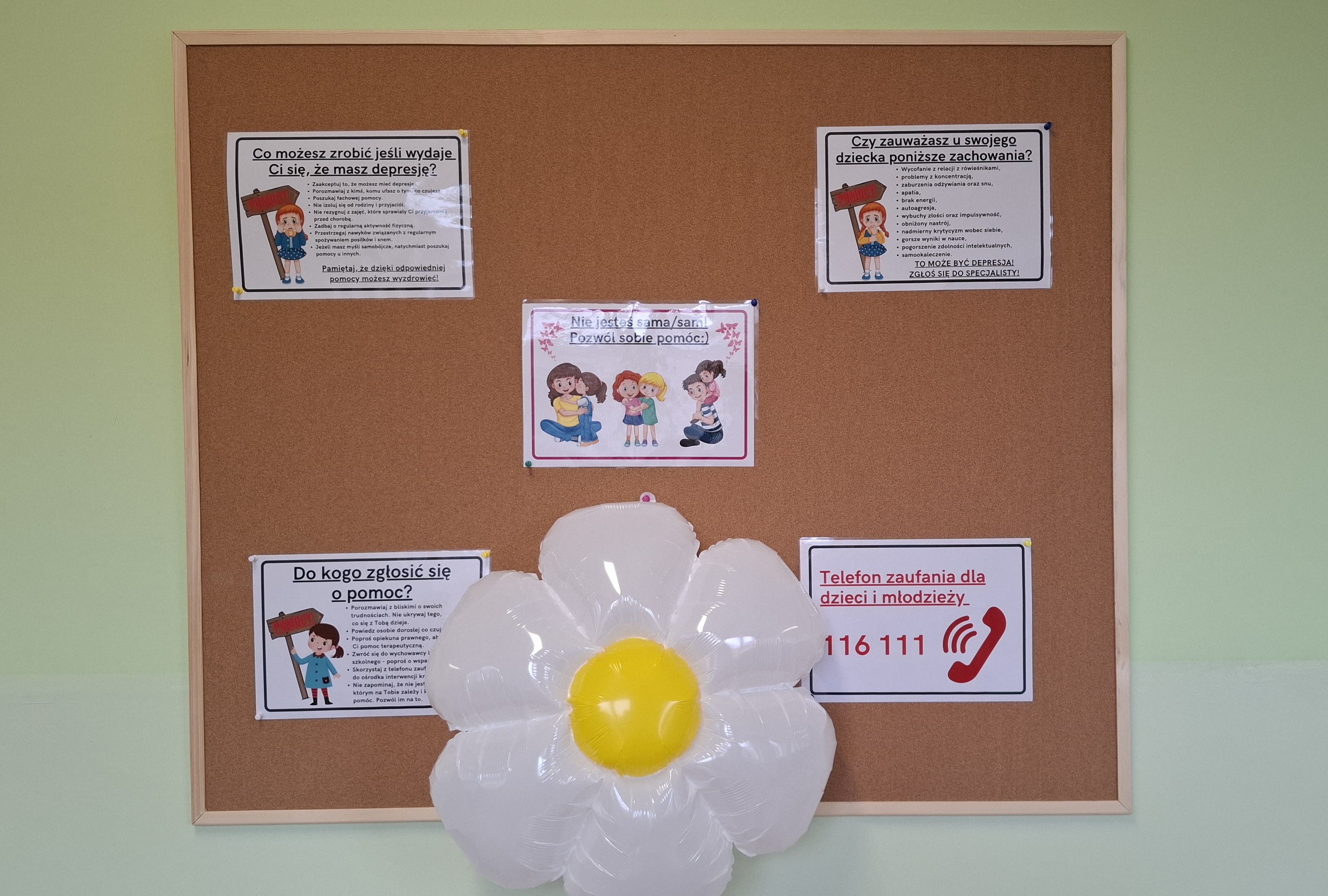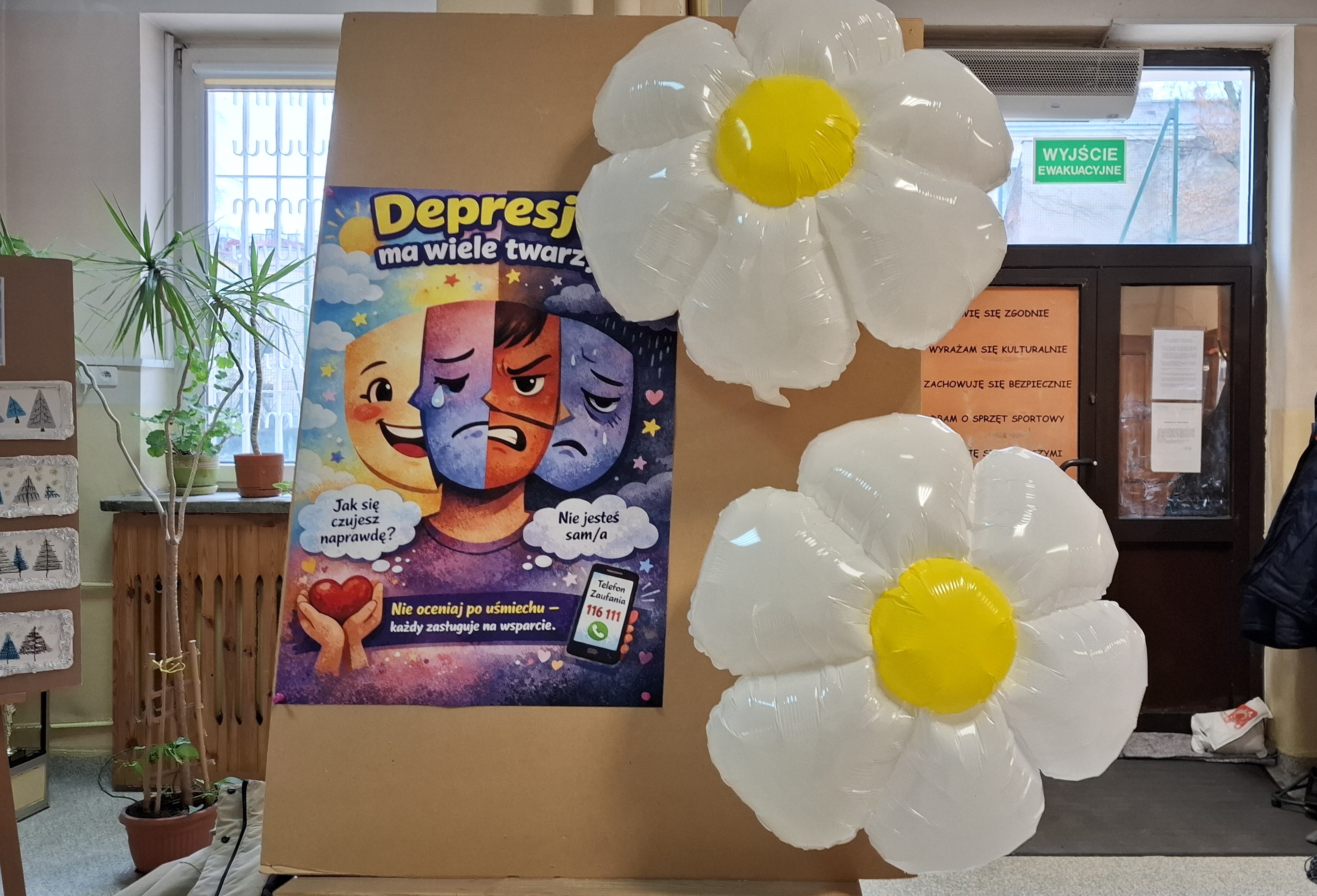 W Światowym Dniu Walki z Depresją, dzięki współpracy z Radą Rodziców, naszą szkołę ozdobiły balony w kształcie stokrotek i plakaty dotyczące depresji.