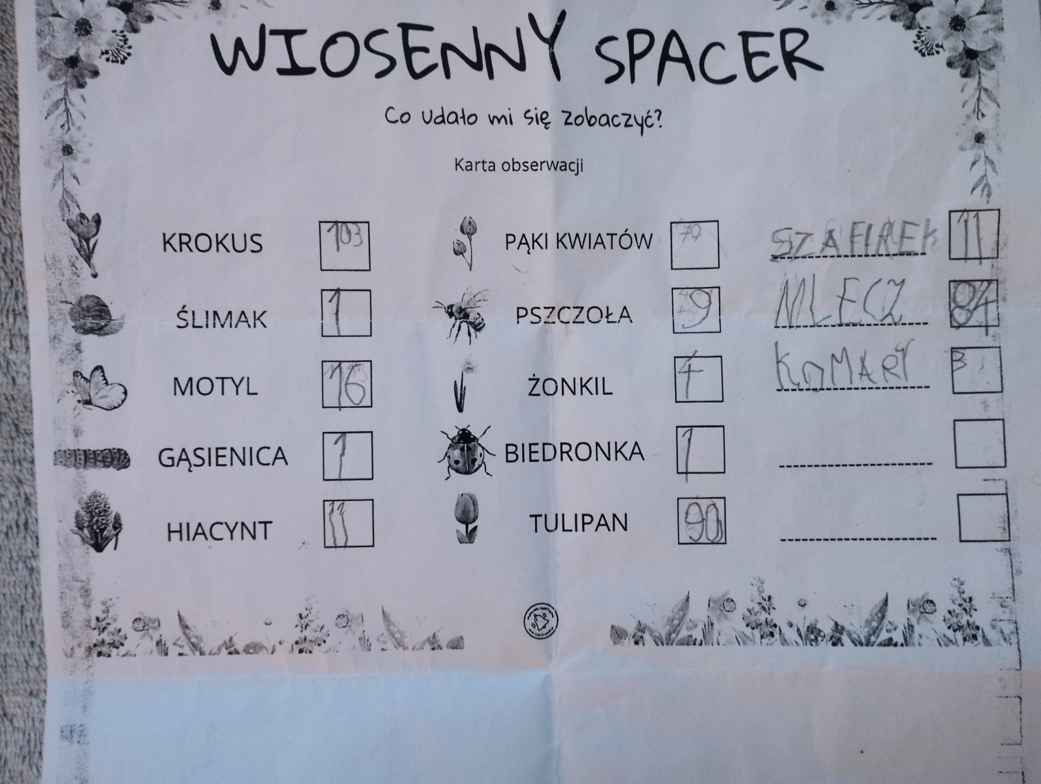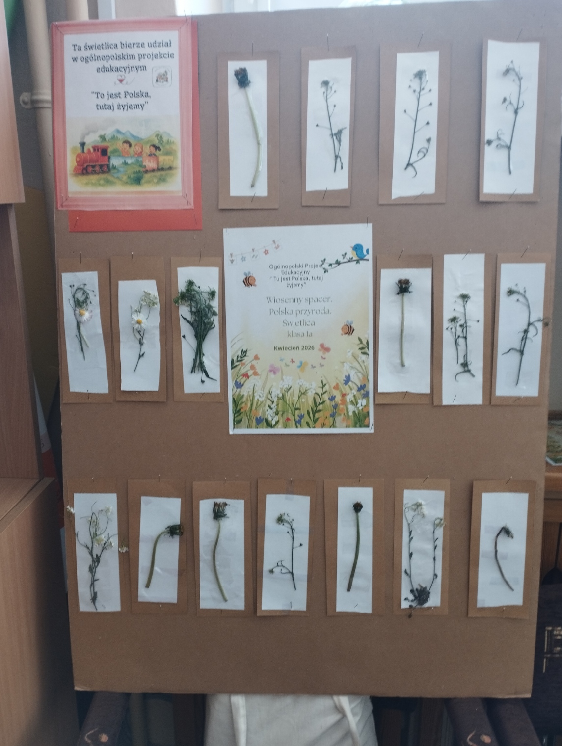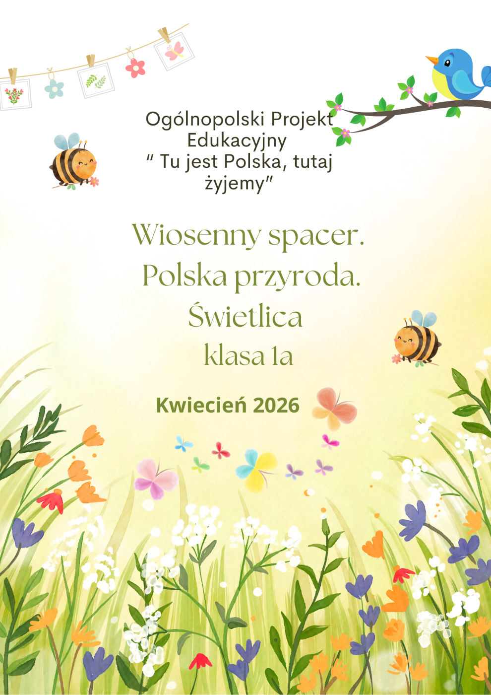 W ramach Ogólnopolskiego Projektu Edukacyjnego „Tu jest Polska, tutaj żyjemy”, w zadaniu kwietniowym uczniowie klasy 1a, uczestniczący w zajęciach świetlicowych, zrealizowali kolejne działanie projektowe. Dzieci, podczas wiosennego spaceru, miały okazję poznać pierwsze oznaki budzącej się do życia przyrody, obserwowały wiosenne kwiaty oraz zwierzęta. Co niektórzy widzieli na spacerze nawet dzika. Była to doskonała okazja do nauki poprzez bezpośredni kontakt z naturą. W sali uczniowie wykonali pracę plastyczną pt. „Zielnik”. Efekty ich pracy można podziwiać przy wejściu do szkoły.