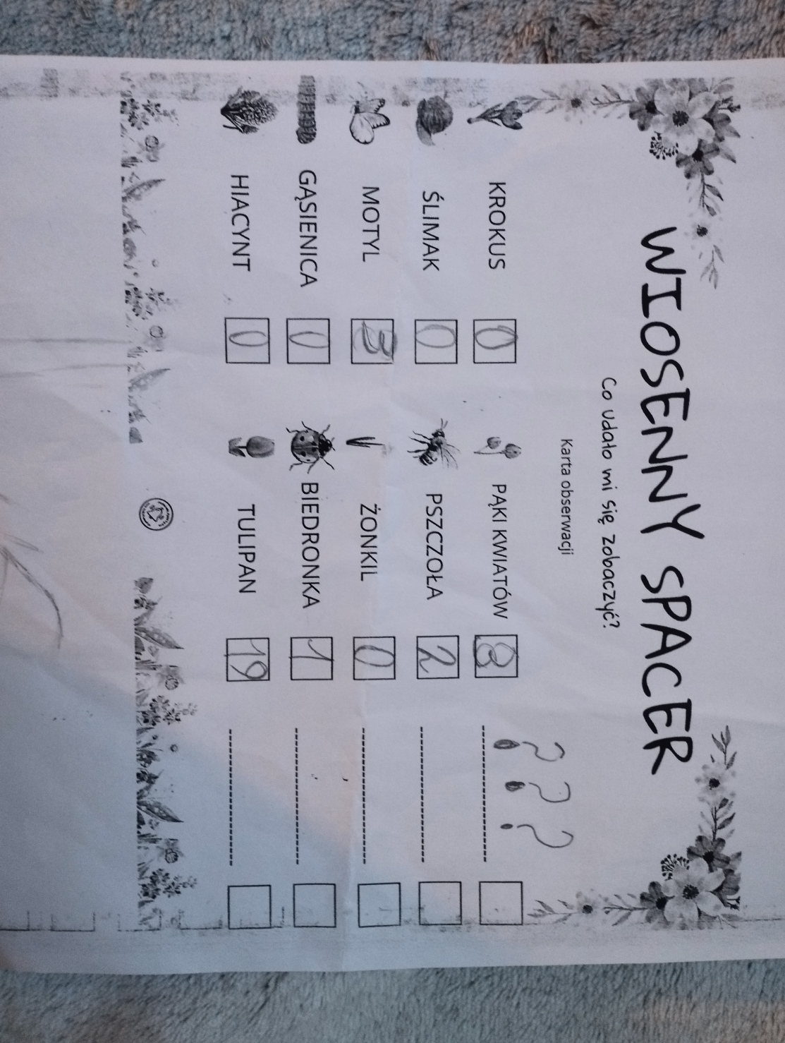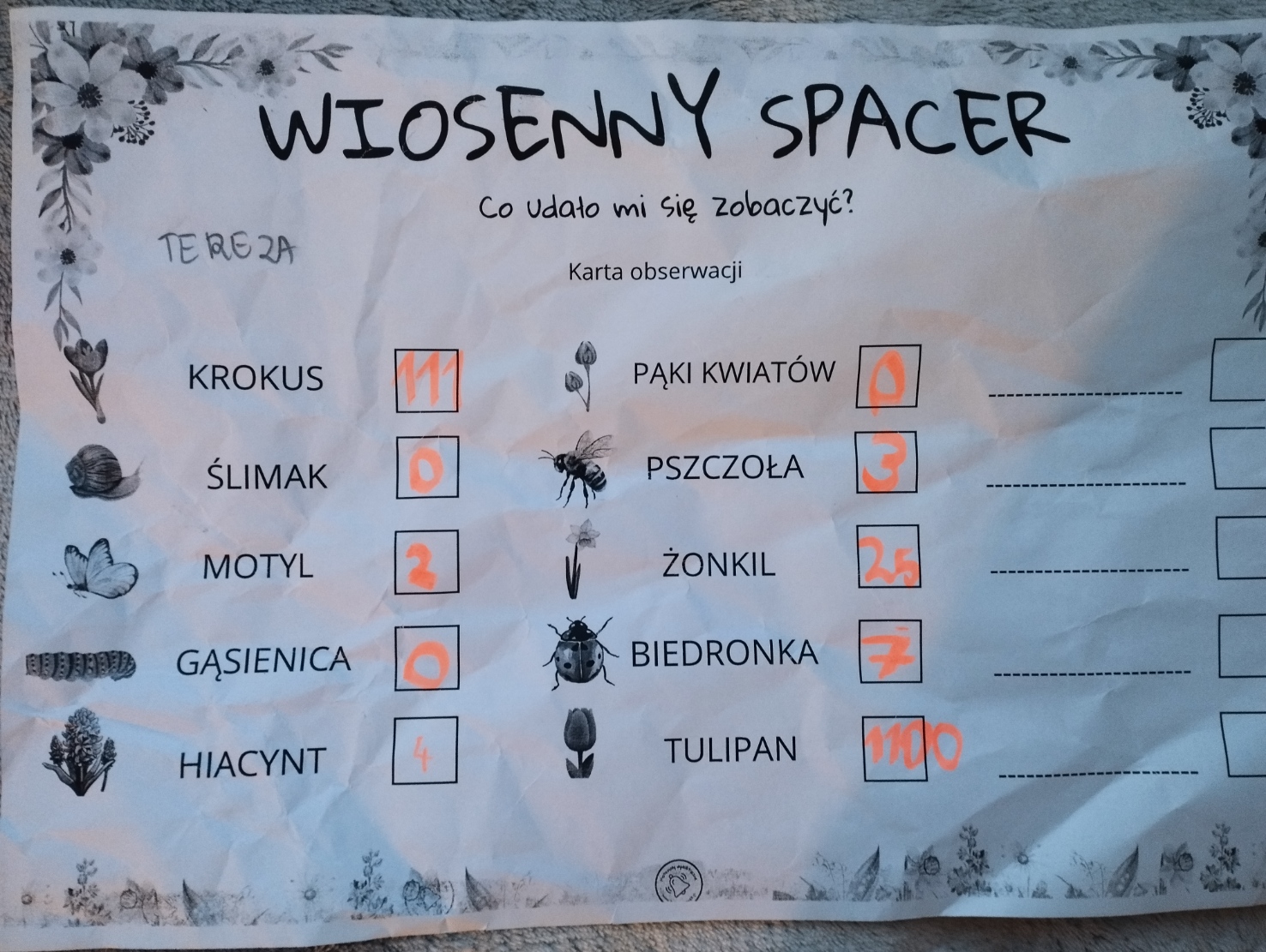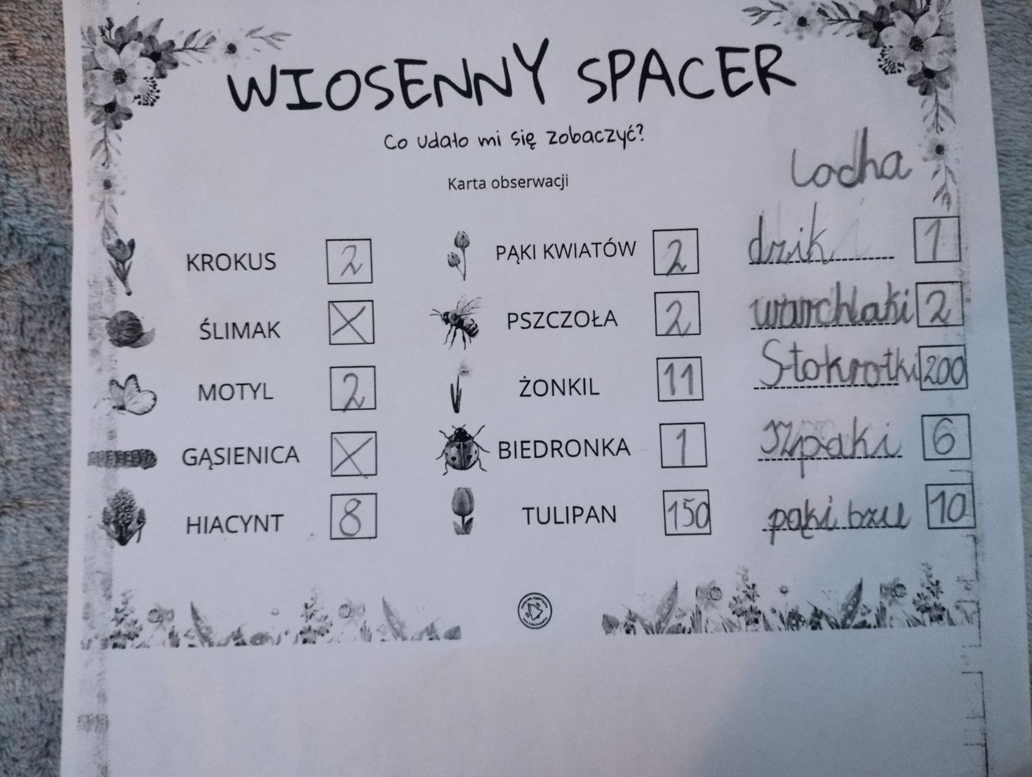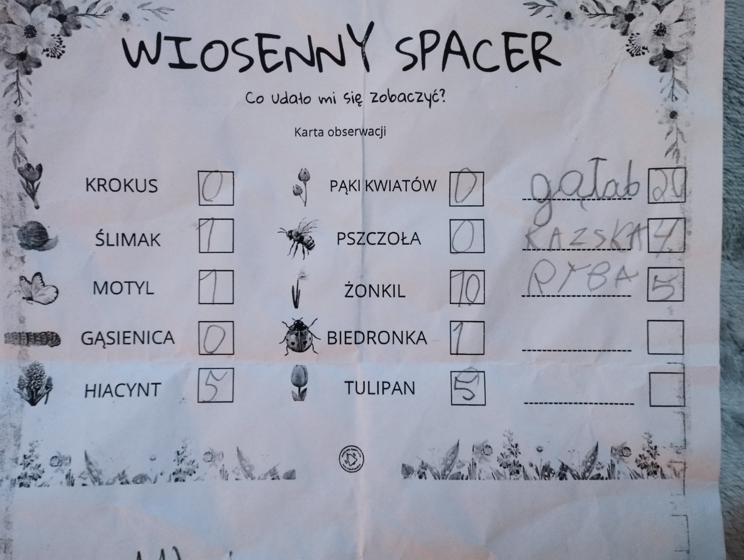 W ramach Ogólnopolskiego Projektu Edukacyjnego „Tu jest Polska, tutaj żyjemy”, w zadaniu kwietniowym uczniowie klasy 1a, uczestniczący w zajęciach świetlicowych, zrealizowali kolejne działanie projektowe. Dzieci, podczas wiosennego spaceru, miały okazję poznać pierwsze oznaki budzącej się do życia przyrody, obserwowały wiosenne kwiaty oraz zwierzęta. Co niektórzy widzieli na spacerze nawet dzika. Była to doskonała okazja do nauki poprzez bezpośredni kontakt z naturą. W sali uczniowie wykonali pracę plastyczną pt. „Zielnik”. Efekty ich pracy można podziwiać przy wejściu do szkoły.